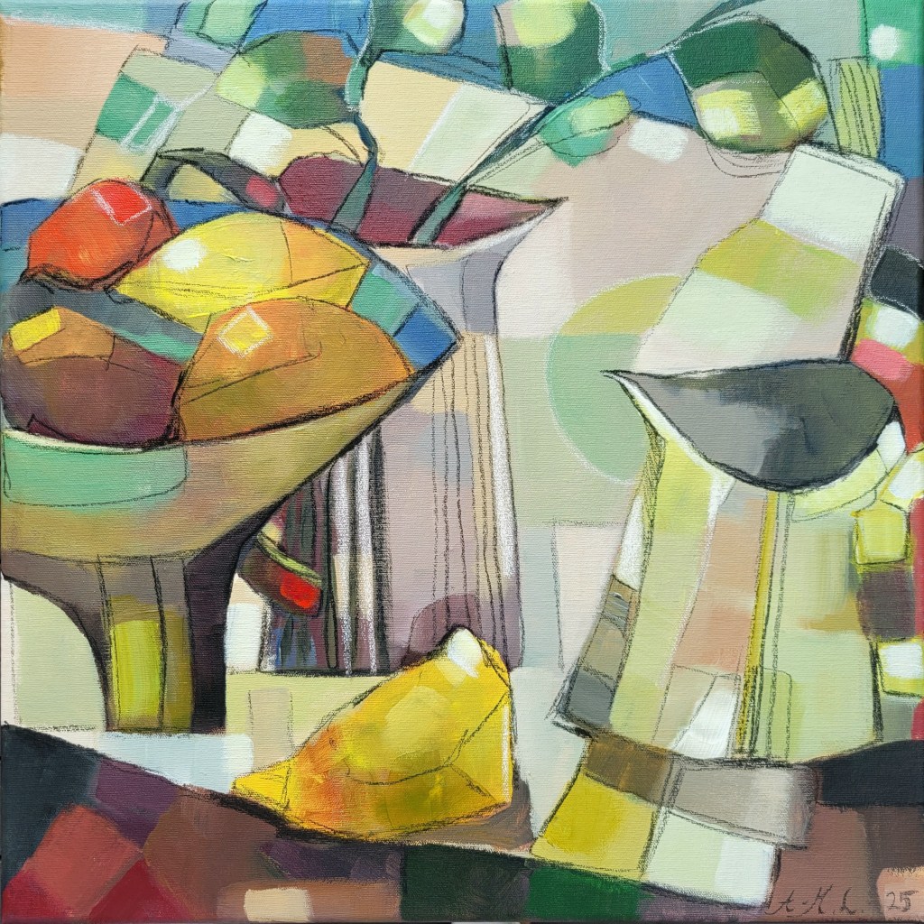 Kulhossa hehkuu sitruunan valo,vierellä kannu, säröinen halo. Värit kuin palat palapelissä, hetki on kiinni ikuisuudessa.
