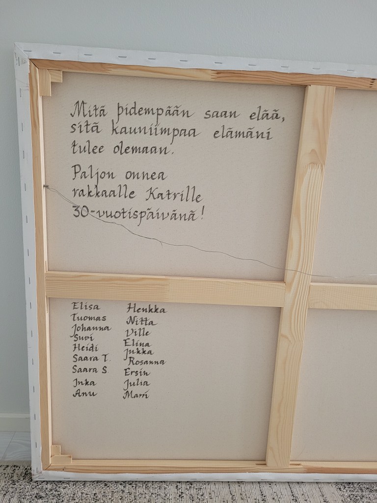 Työn taakse kirjoitin terveiset, jotka ystävät halusivat siihen kirjoitettavan.