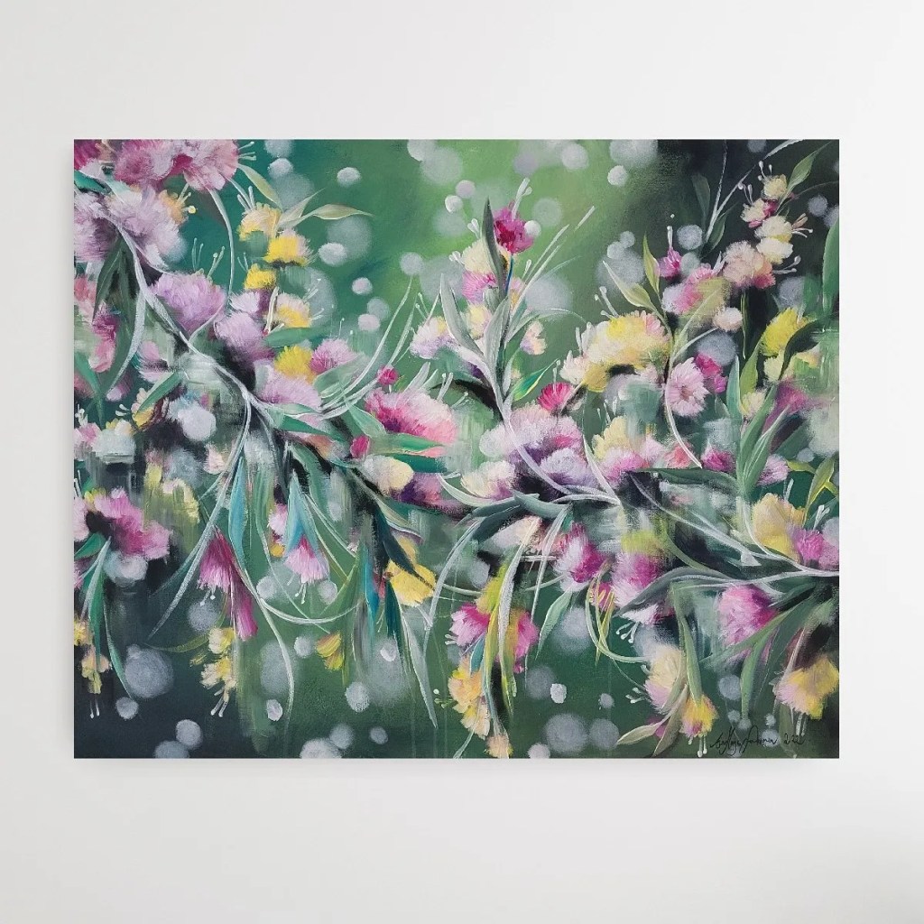 Tämä työ tilattiin iloiselle ja pirskahtelevalle Katrille, joka täytti 30-vuotta. Vaikka en tiedä henkilökohtaisesti kenelle tämä työ meni, olen varma että työ tuo iloa ja energiaa omistajalleen. Minulle lähetettiin tilauksen yhteydessä valokuva synttärisankarista koska kuvahan kertoo enemmän kuin tuhat sanaa! Työhön haluttiin samaa tunelmaa kuin ”uskon keijuihin”-töissä, koska juuri tämä työ oli osunut sankarin silmään Facebookin taidetta kotiin- ryhmässä. Siitä lähtikin ystävien idea tilata tällä samaisella tyylillä toteutettu työ hänelle juuri minulta. Työ annettiin hänelle yllätyksenä, vaikkakin tarina kertoo, että synrrärijuhlat harmittavasti oli peruutettu tämän koronan takia. Kuitenkin elämässä tulee varmasti sellainen aika, että saamme taas juhlia railakkaasti läheistemme kanssa ilman pelkoa ja ahdistusta. Rohkaiskoon tämä iloinen työ odottamaan sitä aikaa.