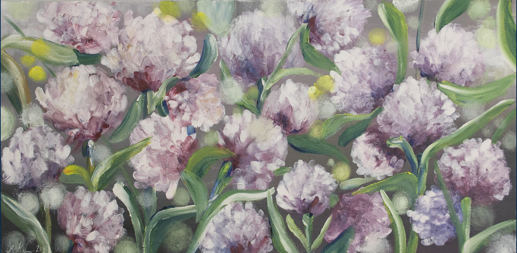 Tämä työ on hämyinen ja pehmoinen kokonaisuus. Harmaalla taustalla on maalauksellisia kukkia ja pieniä valon välähdyksiä. Tämä työ syntyi ihan ”terapiaksi” itselleni. En suunnitellut tai miettinyt vaan annoin ajatusten virrata. Tämä pohja 50×100 oli minulle uudenlainen kokemus. Pitkulainen ja melko matala taulu oli omiaan haastamaan minua siinä, miten sommittelen työn niin että se näyttäisi kokonaisuutena harmoniselta ja sopusuhtaiselta.
