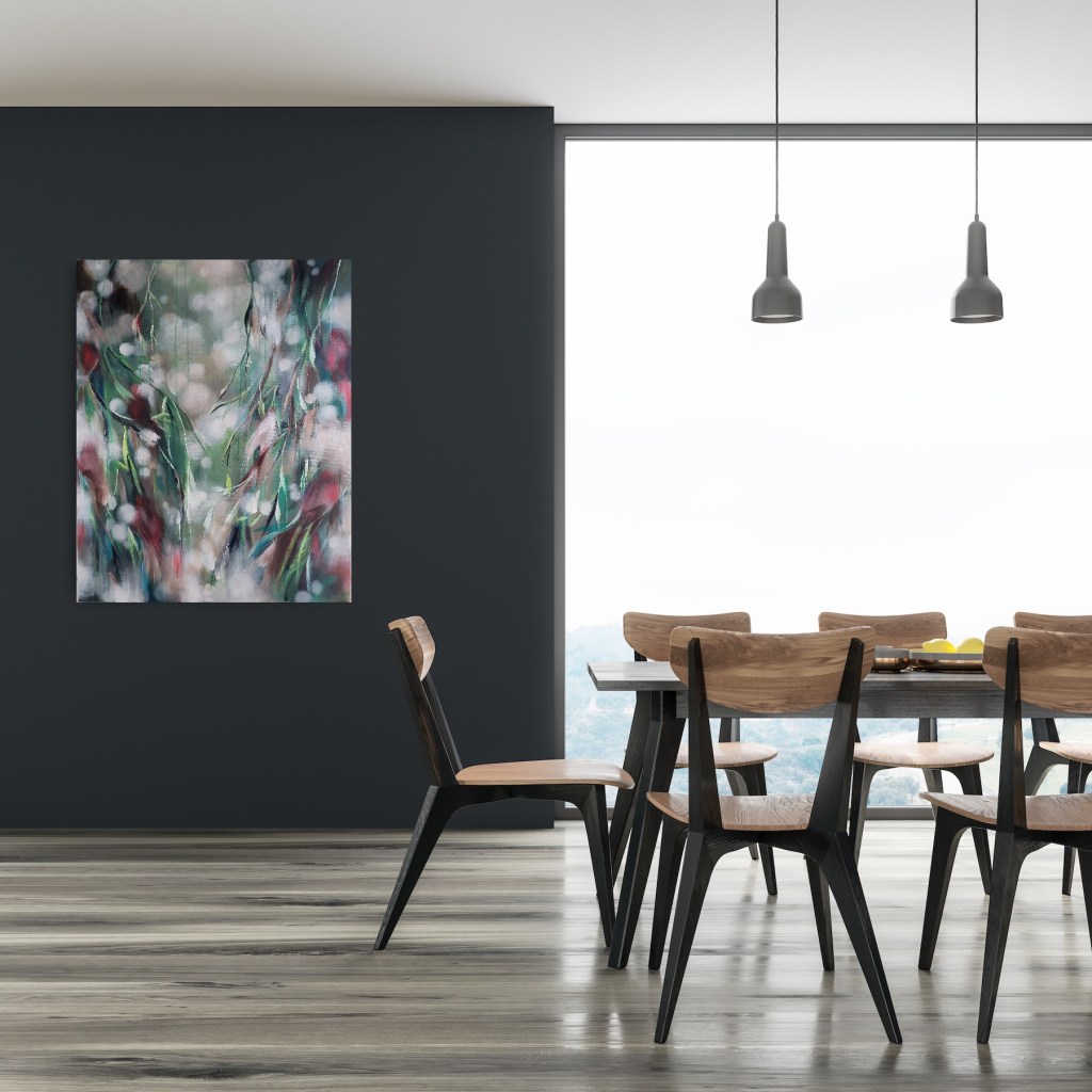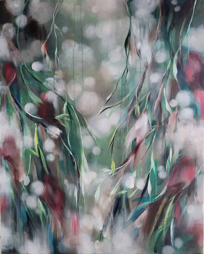 Tämä työ tilattiin syksyllä 2021. Työstin sitä pitkään ja hartaasti. Asiakas toivoi työhön vihreitä lehtiä ja pieniä lintuja, jotka voisivat olla hieman piilossa siellä täällä. Sain työhön tyylilleni uskollisesti paljon sävyjä ja kerroksia, sekä unenomaista tunnelmaa. Työtä katsellessa voikin sieltä löytää vaikka mitä!