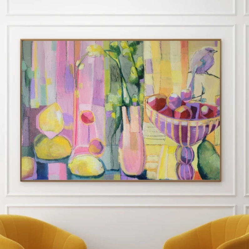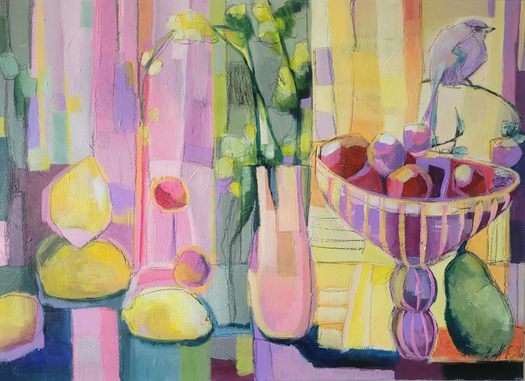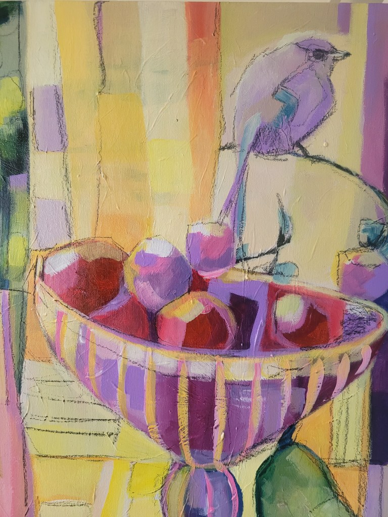 Nyt on tehnyt mieli sekoitella keltaisia ja erilaisia liloja ja vaaleanpunaisen eri sävyjä. Kevät vaikuttaa palettiini jo todella paljon, vaikka luonto onkin vielä melkoisen väritön. Maaliskuu on täynnä kuitenkin juhlia ja synttäreitä niin myös se vaikuttaa värikkäästi ajatusmaailmaani. Taas huomaan, että lintu teki paluun teokseni! Linnun symboliikan tutkiminen onkin minulle loputon aarreaitta. Sama koskee kukkia. Turha yrittää jättää niitä sivuun.