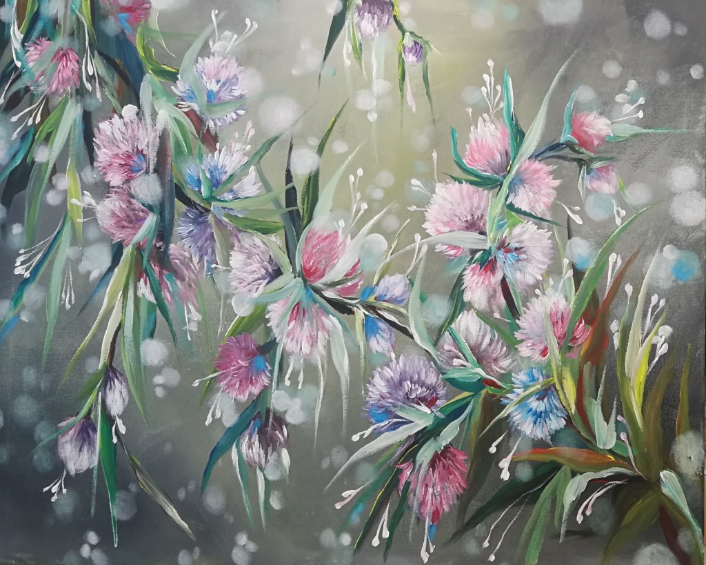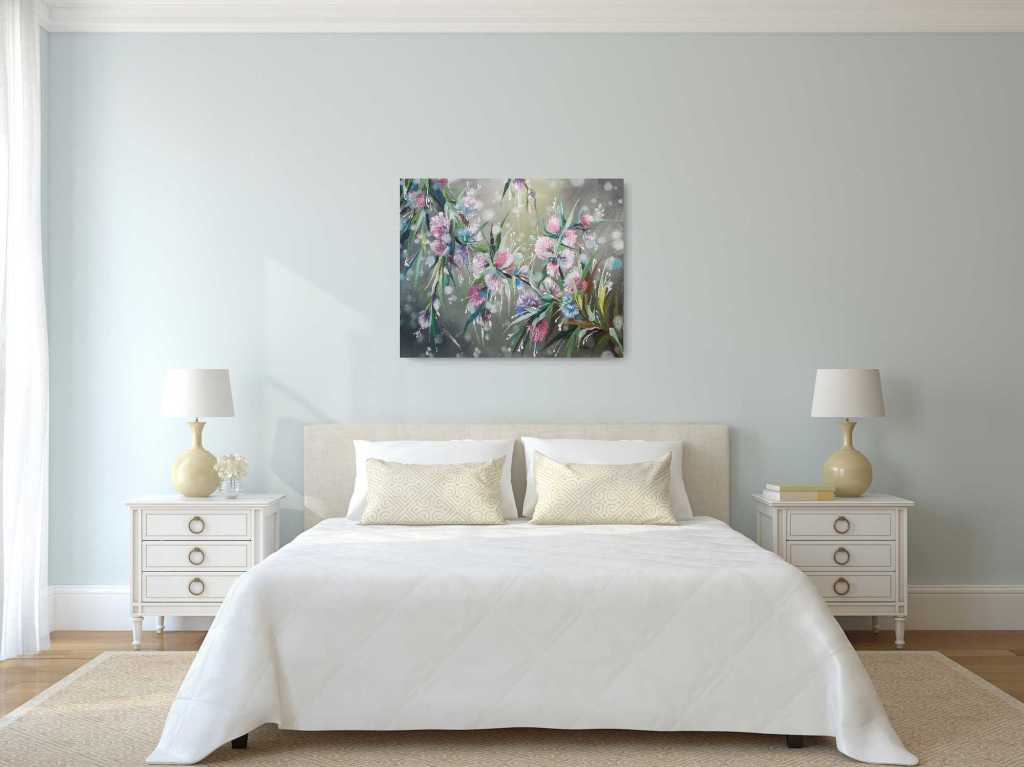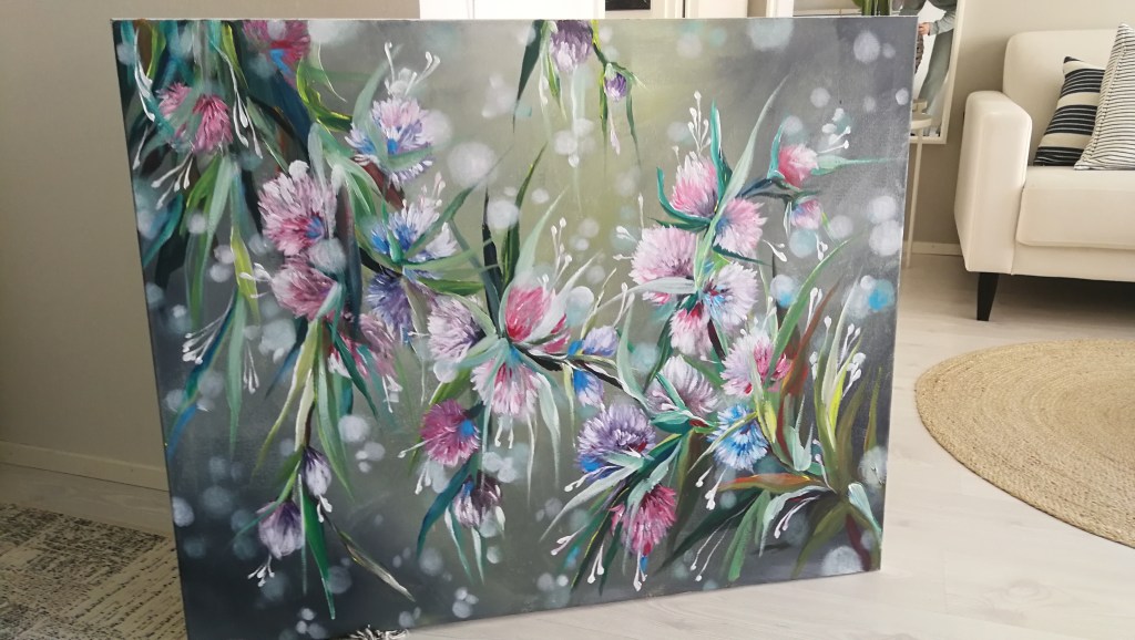 Akryyli kankaalle 80×100 / 2021Tämä työ tilattiin jo vuoden 2020 syksyn puolella. Tilaajana oli erittäin tarkka kollegani, joka halusi työn mökillensä joka on vielä rakenteilla. Mökki tulisi olla valmiina tänä kesänä. Minulla oli siis hänen kanssaan aikaa suunnitella työtä ja seurailla sen etenemistä. Tässä työssä on yhdistelty montaa tyyliäni ja se on saanut viitteitä vanhoista töistäni. Mielestäni tässä on nähtävissä aikaisempien töiden henkeä, uudessa kokonaisuudessa.
