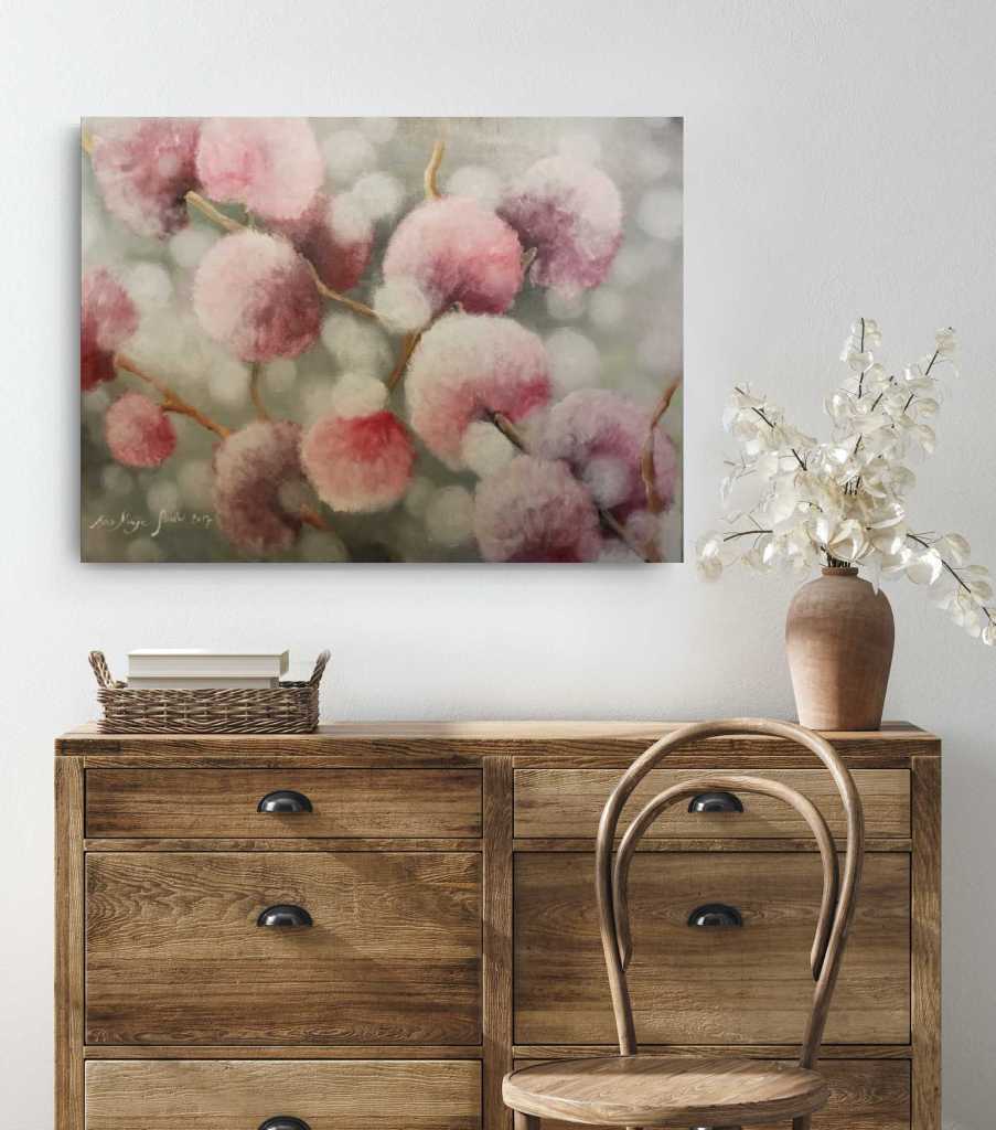 Työ löysi kodin anopiltani. Hän halusi keittiöönsä jonkin työn joka ilahduttaisi häntä arjessa. Hän tiesi hyvin tyylini maalata ja sainkin tähän teoksen toteuttamiseen todella vapaat kädet. Anoppiani kutsutaankin Kitiksi ja siksi tällä työllä on hieman hassu ja henkilökohtainen nimi ”pehmo Kiti”. Työ kuvastaa häntä mielestäni hyvin naisena, äitinä ja vaimona ja ihanana ihmisenä, jota hän todella on!