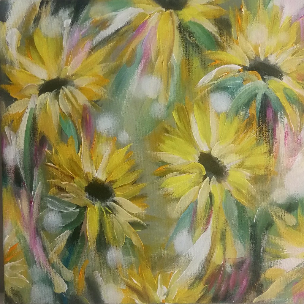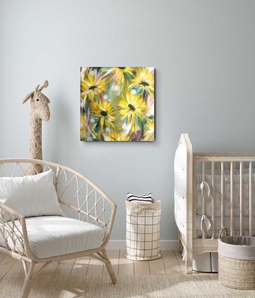 Tämä työ on pari "pikkuiselleni"- vaaleanpunaiselle kukkatyölle. Nämä tilattiin pienille tyttövauvoille heidän huoneisiinsa. Tämä työ on iloinen ja aurinkoinen. Molempiin näihin lasten töihin toivottiin suojelevaa enkelinsiipien havinaa hyvin abstraktissa muodossa. Tulkitsin tätä toivetta vetämällä puhtaita valkoisia siipimäisiä veroja kukkien lomaan.