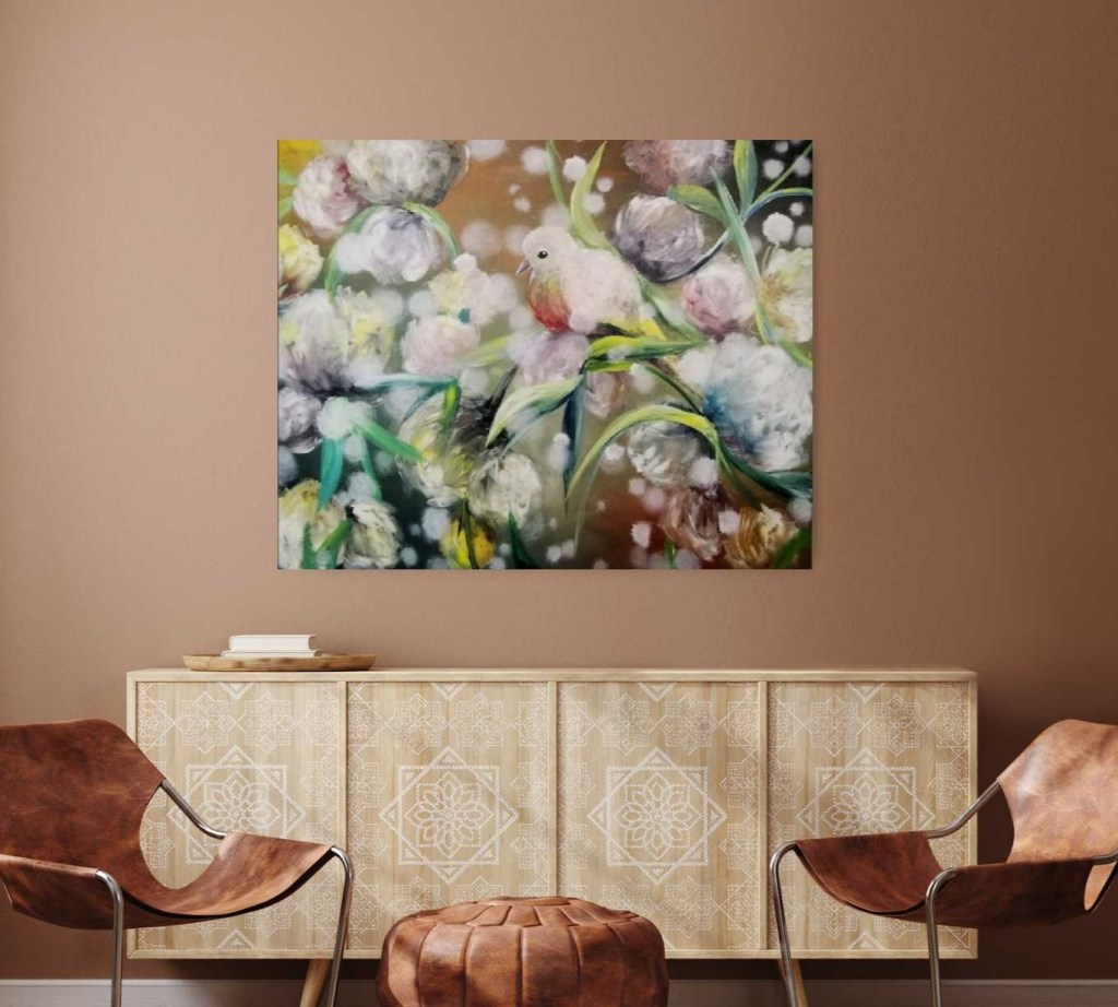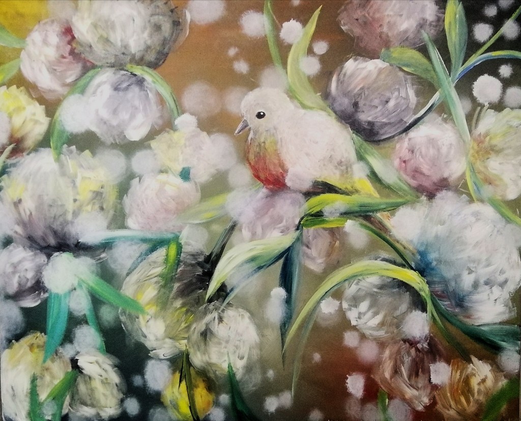 Tämä suloinen pieni lintu meni entiselle kollegalleni, joka oli elämässään uusien asioiden äärellä. Hän oli muuttanut asumaan yksin omaan asuntoonsa ja sisusti sitä innokkaana. Hän toivoi minulta makuuhuoneeseensa jotain hauskaa ja pehmeää työtä jossa olisi pieni lintu mukana. Makuuhuoneen värit olivat lämpimät ja kodikkaat. Sieltä löytyi ruskeaa, harmaata, keltaista ja ruosteenkin sävyjä. Siksi käytin myös niitä värejä tässä työssä. Toivon että tämä lintu kuvastaa hyvin työn omistajaa ja tuo hänelle iloa joka päivä ja muistuttaa että yksinäisyys voi olla kaikkea muuta kuin hiljainen tyhjiö.