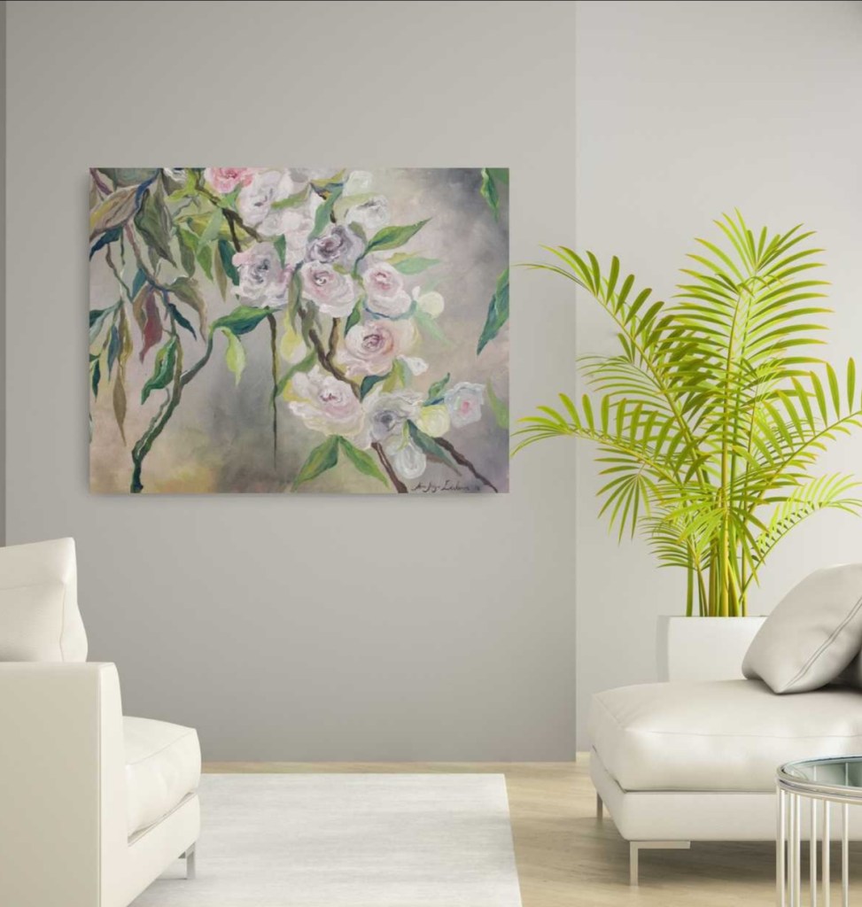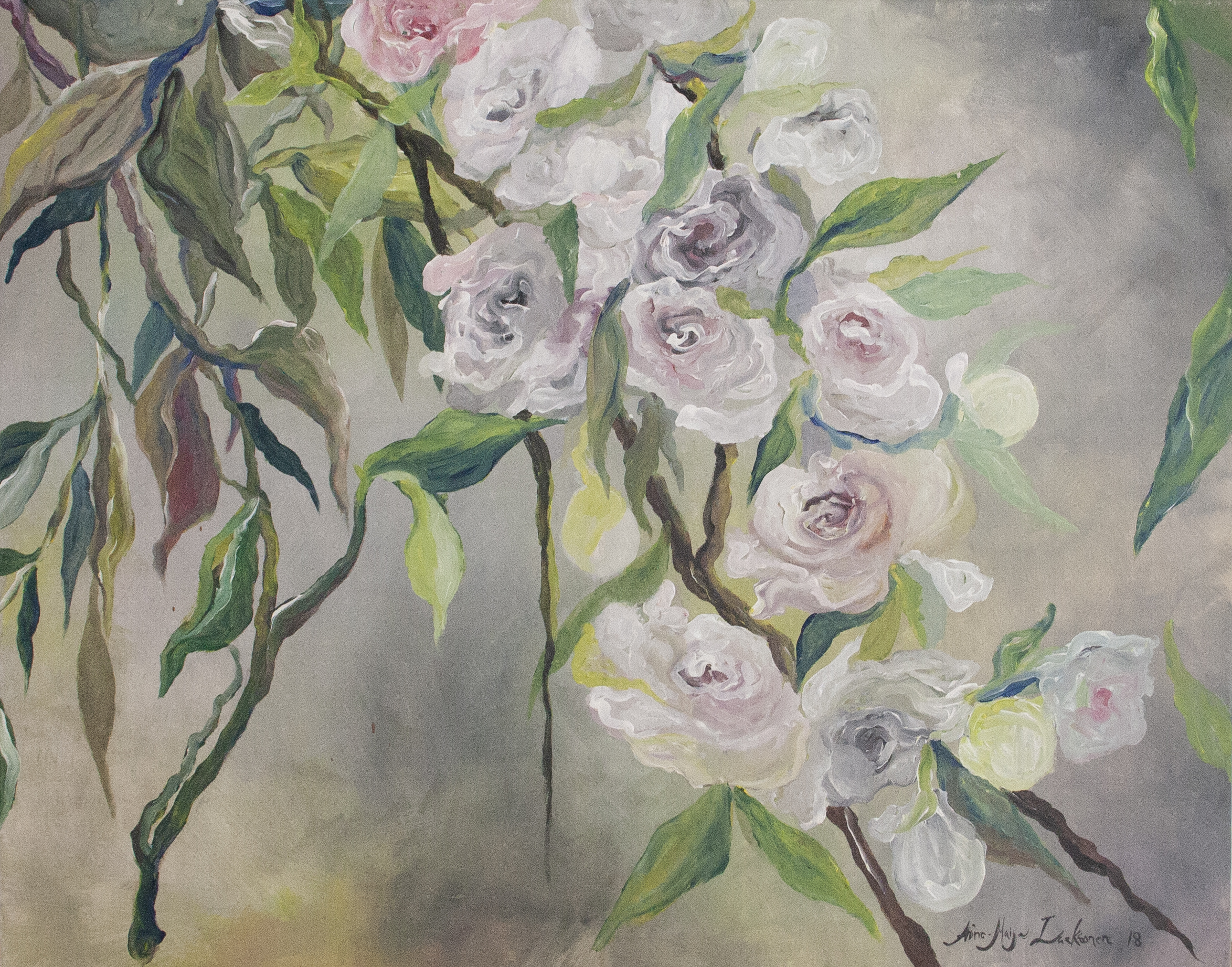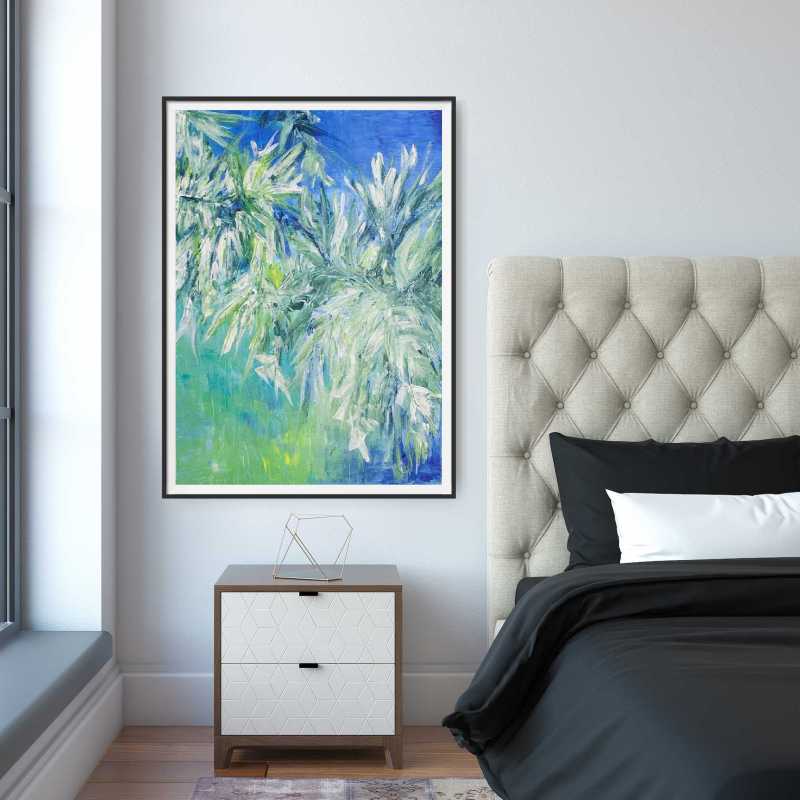 Tämä kyseinen maalaus meni omien vanhempieni seinälle makuuhuoneeseen. Tässä huoneessa on rauhoittavat värit, valkoista, ja murrettua vihreää sekä pieni ripaus kultaista. Tämä työ rauhoittaa huonetta ja on jollain tavalla ajaton ja klassinen. On ihanaa kun oman taideteoksensa voi nähdä aina kun käy omien vanhempiensa kotona kyläilemässä. Työ on siis jäänyt niin sanotusti perheeseemme!