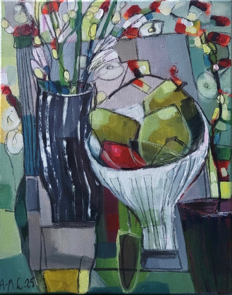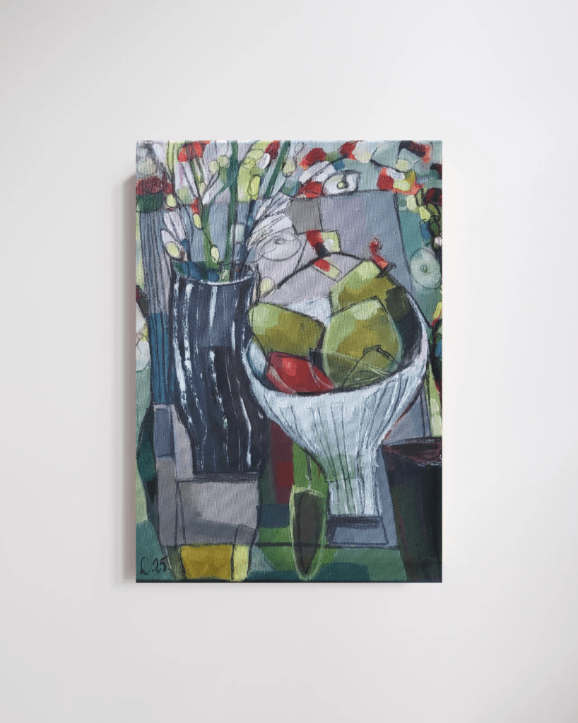 Kulhossa lepäilee hedelmiä. Väriblokit tanssivat niiden ympärillä kuin iloiset pikkulelut. Teos on kuin naurun ja värien pikkujuhla silmille.