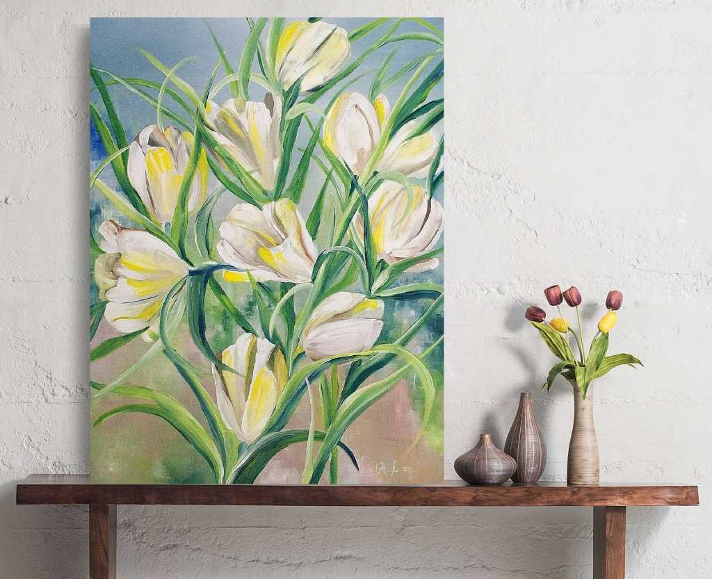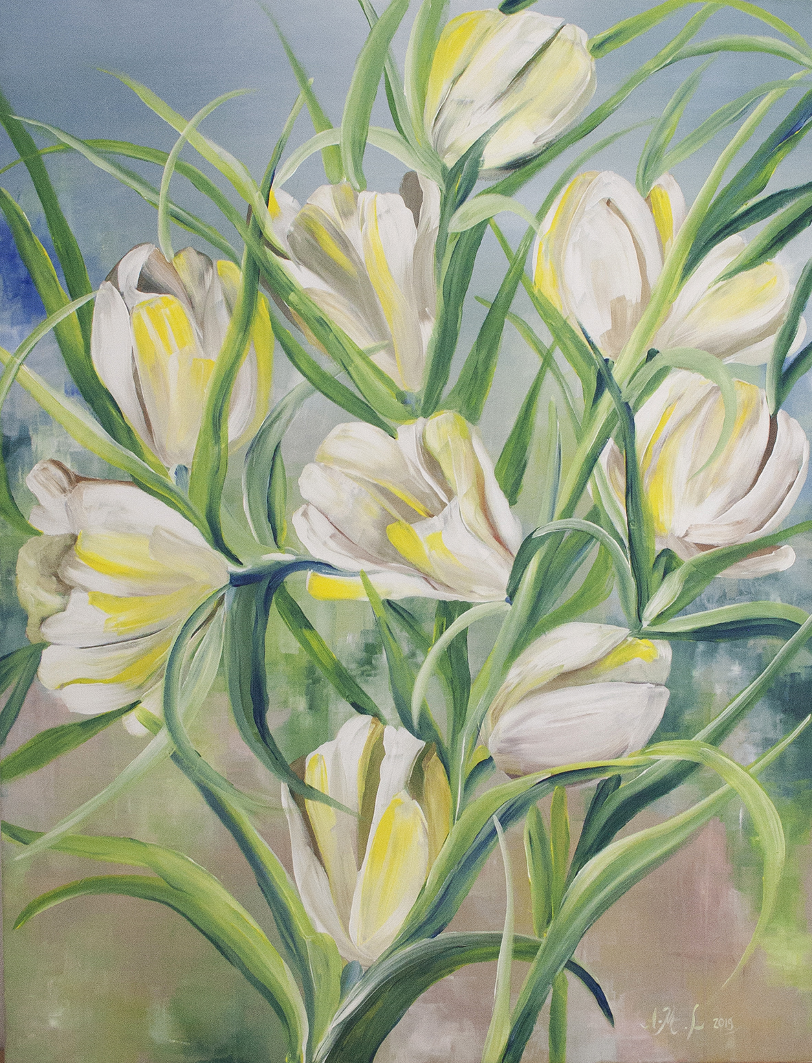 Nupullaan syntyi hyvin varhain keväällä 2018 vielä pimeyden keskellä. Sain lahjaksi tulppaaneja, jotka ovat ensimmäisiä varmoja alkukevään merkkejä minulle. Vaikka talvi tuntuukin pitkältä joka vuosi, kevät tulee aina vaikka se tuntuukin uskomattomalta. Nupullaan on täynnä toivetta ja haavetta tulevasta keväästä. Työssä on vielä kylmä, mutta avautuvat nuput tuovat toivoa ja antavat uskoa siihen että pimeä talvikin tulee joskus päätökseen.