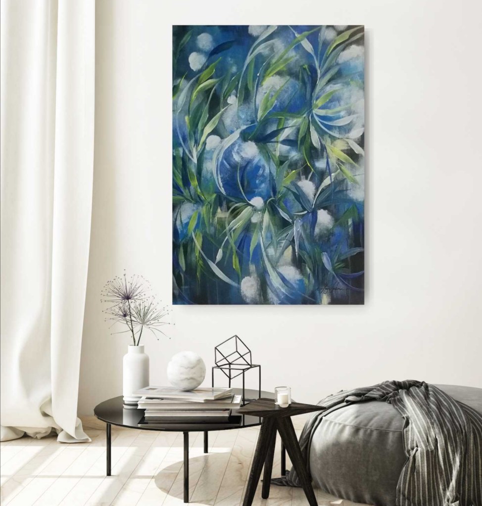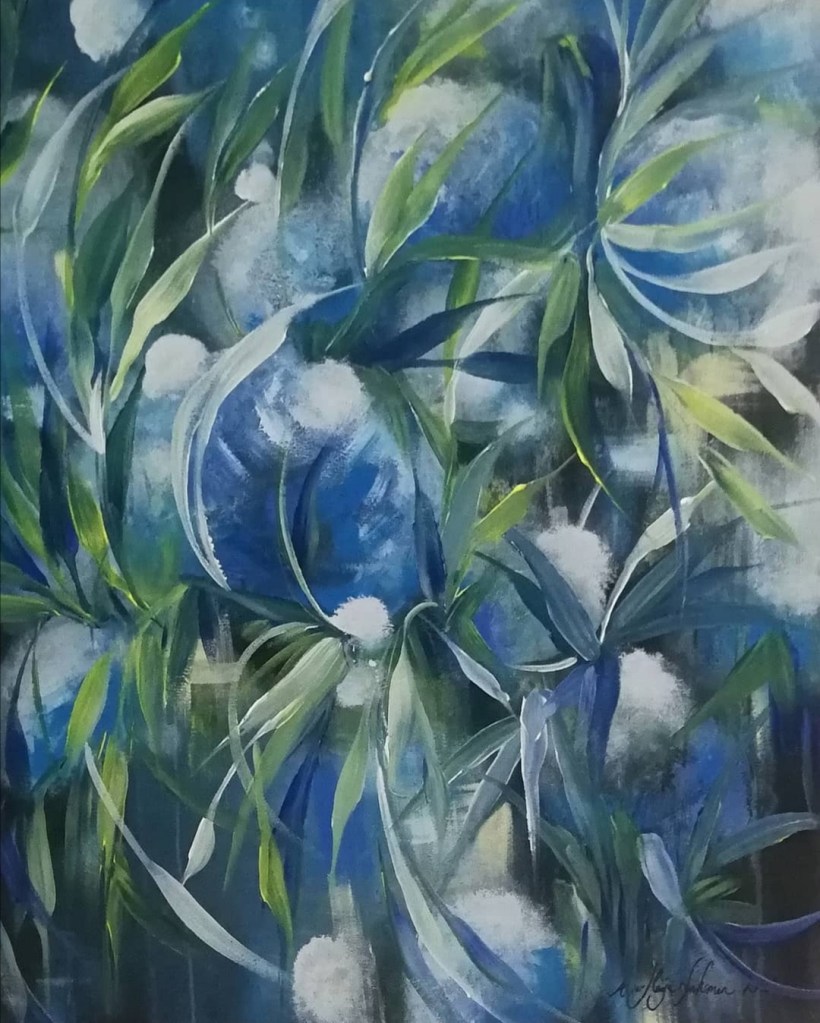”Tuulessa” tilattiin töistä läksiäislahjaksi. Työhön toivottiin syviä tummia sinisen sävyjä ja tätä pystyä asettelua, mutta muuten aihe ja tyyli jätettiin vapaaksi. Mitä lähtö merkitsee minulle kun mietin kenelle työ tulee ja mihin elämänvaiheeseen? No, mielestäni se on liikettä johonkin suuntaan. Usein ajattelemme ainakin että liike olisi eteenpäin. Mielestäni näin ei kuitenkaan aina välttämättä ole. Liike voi olla myös pyöreää ja toistaa kehää, ikään kuin sanontakin kuuluu ”ympäri käydään, yhteen tullaan”. Onko se negatiivista vai positiivista? Ehkä molempia. Kuitenkin tuuli on energiaa ja se virtaa ja tuulettaa, se ei ole paikoillaan vaan kulkee villinä ja vapaana. Tässä työssä voi tuntea sen voiman ja virtauksen! Toivon kaikkien elämään energisoivaa ja virtaavaa tuulta jota ei voi kahlita.